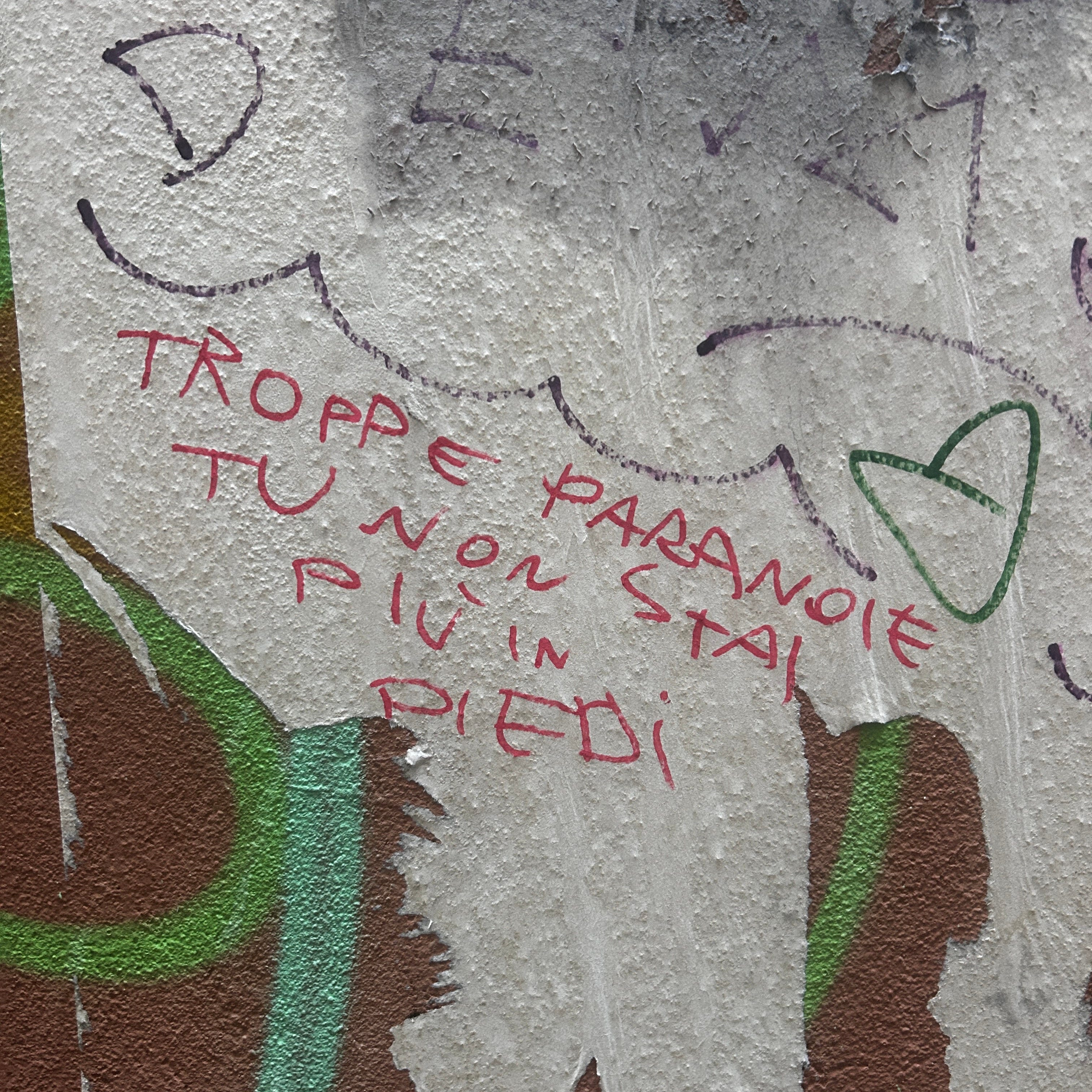 «Troppe paranoie tu non stai più in piedi» sembra un piccolo promemoria urbano della lezione di Spinoza: le passioni tristi indeboliscono la nostra potenza di agire. Per Spinoza, ogni paura che ci immobilizza è un taglio netto alla nostra capacità di esistere pienamente. La frase, buttata su un muro come un rimprovero affettuoso, ci ricorda che il mondo non si interpreta meglio quando ci si chiude, ma quando si resta in piedi – nonostante tremare. E che la libertà inizia laddove smettiamo di consegnare la nostra energia al sospetto.