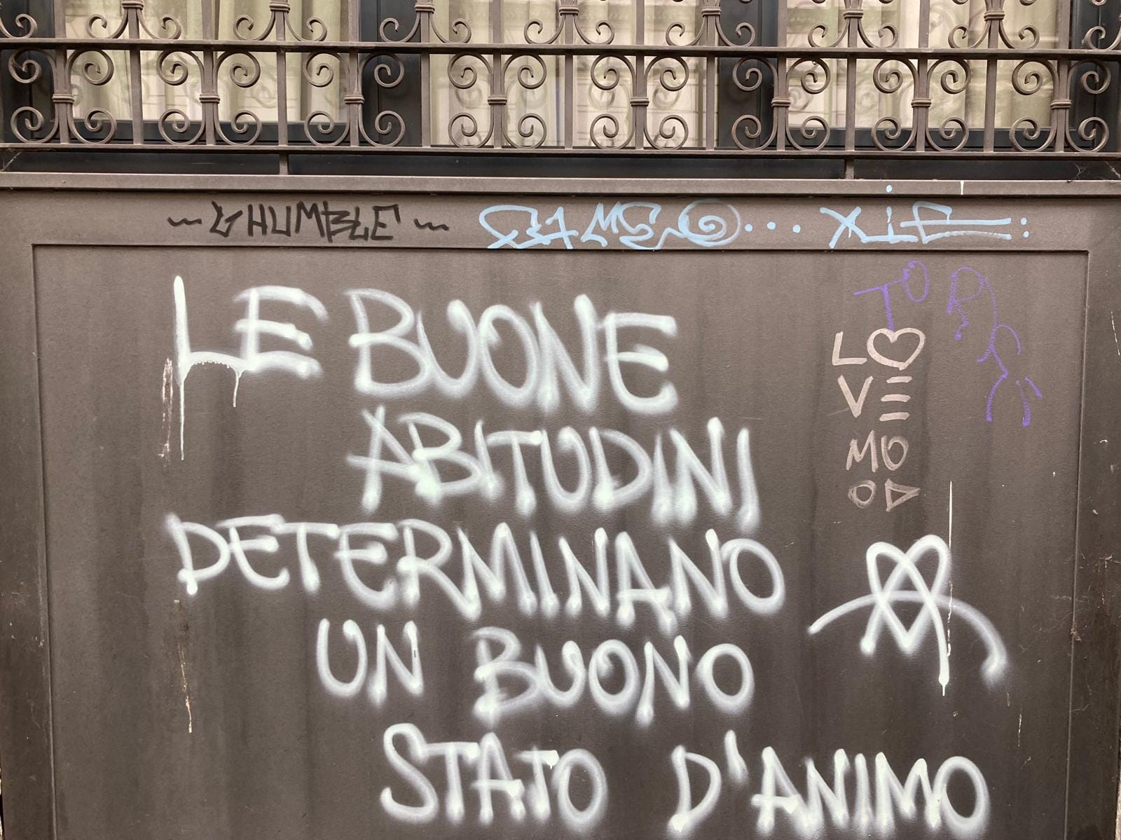 Una frase che riporta immediatamente ad Aristotele e alla sua idea di virtù come hexis - una disposizione stabile dell’anima che non si conquista una volta sola, ma si costruisce giorno dopo giorno attraverso la ripetizione. Nell’Etica Nicomachea, Aristotele è esplicito: non diventiamo coraggiosi pensando al coraggio, ma compiendo atti coraggiosi. Non diventiamo giusti meditando sulla giustizia, ma agendo con giustizia. Le abitudini, per Aristotele, non sono una scorciatoia verso la virtù: sono la virtù stessa, incarnata nel corpo e nel gesto quotidiano. «Le buone abitudini determinano un buono stato d’animo» suona allora come un riassunto etico di tremila anni fa scritto su un muro di periferia.